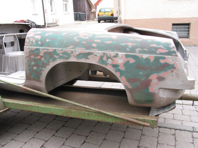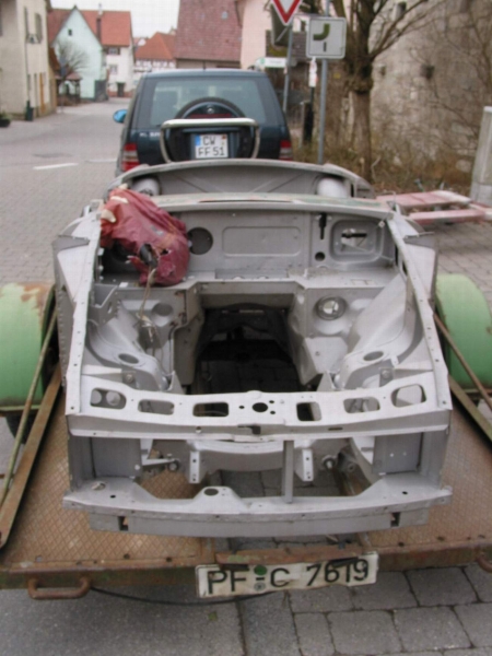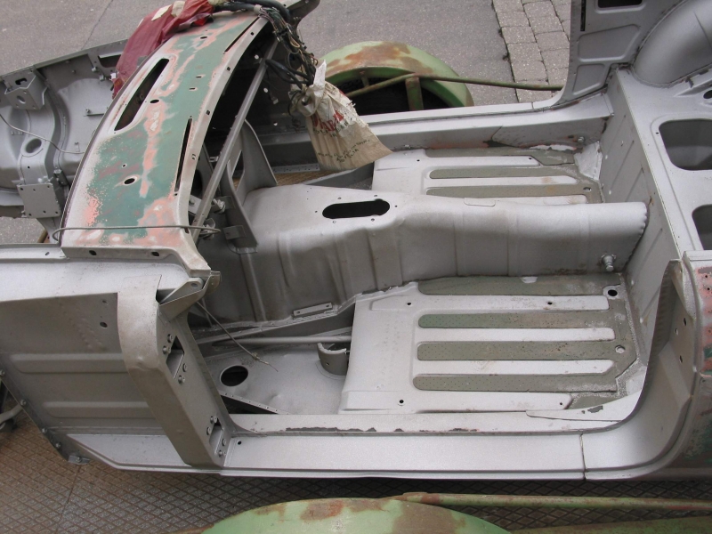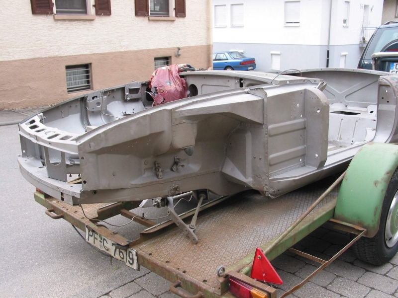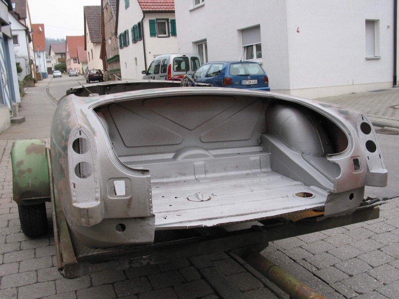 Nachdem der Lack im Motorraum durch vorausgegengene Arbeiten großen Kontakt mit Bremsflüssigkeit gehabt haben musste, war es nicht mehr weit den Motor samt Getriebe, das Fahrwerk, die Innenausstattung und alle Anbauteile zu demontieren. In diesem Zustand konnte die Karosse jetzt zum Sandstrahlen, um jeglichen Rost zu beseitigen.