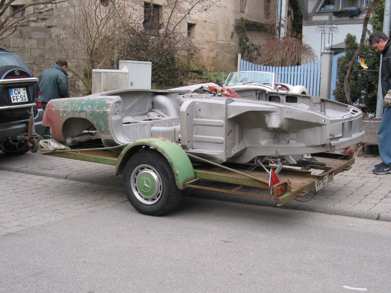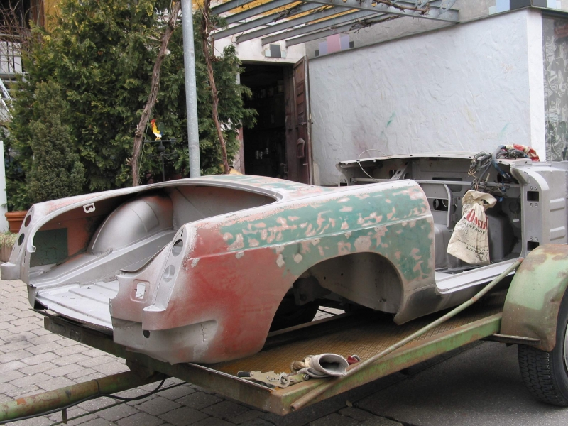 Nachdem der Lack im Motorraum durch vorausgegengene Arbeiten großen Kontakt mit Bremsflüssigkeit gehabt haben musste, war es nicht mehr weit den Motor samt Getriebe, das Fahrwerk, die Innenausstattung und alle Anbauteile zu demontieren. In diesem Zustand konnte die Karosse jetzt zum Sandstrahlen, um jeglichen Rost zu beseitigen.
